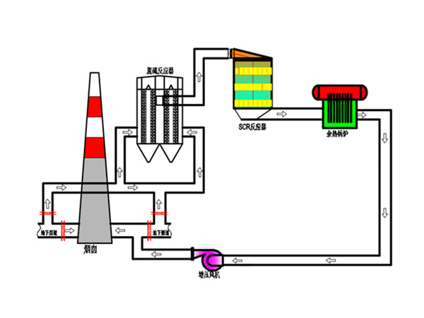 焦炉烟气从两个地下烟道取气,先通过钙基颗粒体干法脱硫,烟气中的SO2与钙基颗粒体脱硫剂通过化学反应与物理吸附去除,同时脱硫剂床层具有阻尘除尘的作用,去除部分粉尘。干法脱硫系统温降约5~10℃,脱硫后的烟气进入中低温SCR脱硝系统,烟气中的NOX在反应器中与氨在催化剂的作用下发生还原反应转化为氮和水,实现脱除NOx的目的,脱硝系统温降约5~10℃。脱硫脱硝后的烟气通过余热回收系统进行热量回收,排烟温度约170℃。净烟气通过风机由原烟囱高空排放。