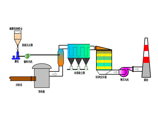 从预热器出来的烟气然后进入钠基干法脱硫反应器(改造原有烟道为反应器),碳酸氢钠粗粉通过磨机作用磨成粒径800目以上(20um左右)的细粉,随后通过输送风机送至脱硫反应器与SO2进行反应,实现脱硫功能。脱硫后,烟气经过除尘系统,将颗粒物捕捉,使颗粒物浓度达标排放。脱硫除尘后的烟气进入超低温SCR脱硝系统,烟气中的NOX在反应器中与氨在催化剂的作用下发生还原反应转化为氮和水,实现脱除NOx的目的,脱硝系统温降约5~10℃。净烟气通过风机由原烟囱高空排放。